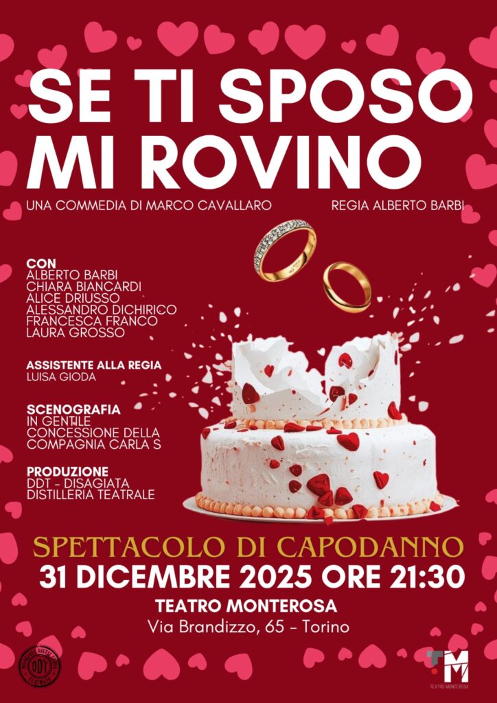 Festeggia il capodanno al Teatro Monterosa con la compagnia teatrale DDT, che il 31 dicembre 2025 dalle ore 21.30 presenterà il Gran Galà di Capodanno con lo spettacolo Se ti sposo mi rovino”, di Marco Cavallaro.